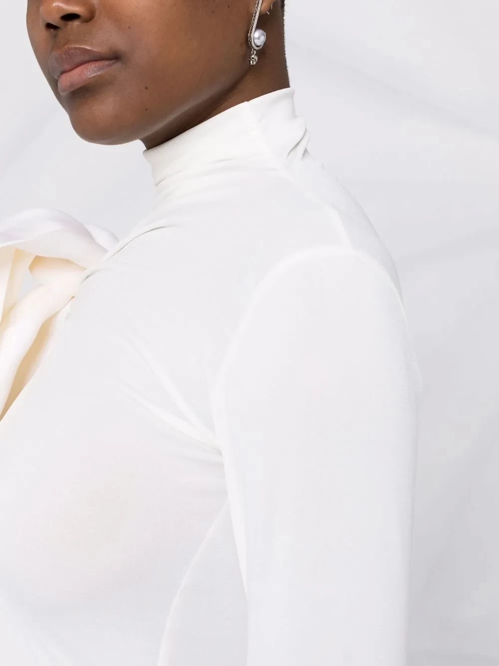 Presented in a white colourway, this mock-neck fitted top from Atu Body Couture is characterised by the oversized bow detail on the shoulder.