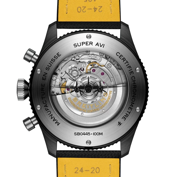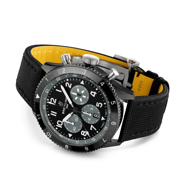 SB04451A1B1X1 Breitling This watch has a 46 mm black ceramic case. Bidirectional rotating black ceramic bezel. Black dial with three gray sub-dials. Arabic numerals with luminescent coating. Black and white hour hands with luminescent coating. Central second hand. This watch has three chronograph sub-dials at 3 ,6 and 9 o'clock. The date window is located at the 6 o'clock position. The watch performs following functions: hours, minutes, seconds, date, chronograph. Self-winding mechanical movement is powered by a Сalibre B04 (Manufacture). Power reserve approximately 70 hours. Case Thickness - 15.9 mm. Case back is transparent. Sapphire crystal protects front and back side of the watch. Black calfskin leather strap with folding clasp buckle. This model is water-resistant up to 100 m.