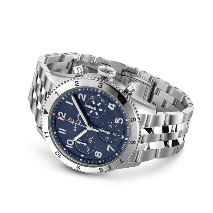 A233801A1C1A1 Breitling This watch has a 42 mm Stainless steel case. Bidirectional rotating Stainless steel bezel engraved with Arabic numerals. Blue dial with three sub-dials. Arabic numerals with luminescent coating. Silvery hour hands with luminescent coating. Central second hand. This watch has three chronograph sub-dials at 3 ,6 and 9 o'clock. The watch performs following functions: hours, minutes, seconds, chronograph. Self-winding mechanical movement is powered by a Сalibre 23. Power reserve approximately 48 hours. Case Thickness - 14.7 mm. Case back is solid. Sapphire crystal protects front side of the watch. Stainless steel bracelet with folding clasp buckle. This model is water-resistant up to 100 m.