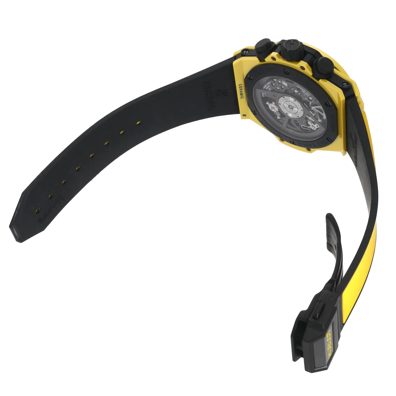 421.CY.471Y.RX Hublot  This watch has a 44 mm polished yellow ceramic case. Fixed polished yellow ceramic bezel is secured with 6 screws. Yellow inner bezel with minute scale. Skeleton dial with two sub-dials. Arabic numerals with luminescent coating. Yellow skeleton hour hands with luminescent coating. Central second hand. This watch has two chronograph sub-dials at 3 and 9 o'clock. The watch performs following functions: hours, minutes, seconds, chronograph. Self-winding mechanical movement is powered by a Сalibre HUB1280 UNICO. Power reserve approximately 72 hours. Case back is transparent. Sapphire crystal protects front and back side of the watch. Yellow rubber strap with folding clasp buckle. This model is water-resistant up to 100 m.