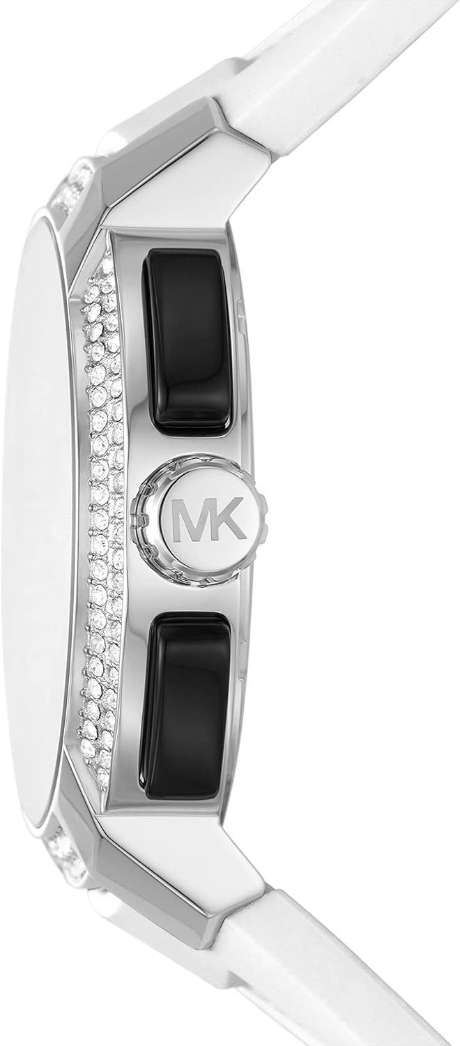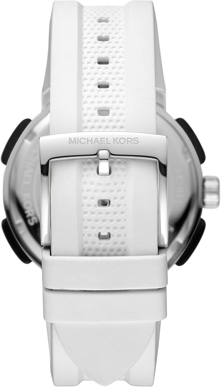 Imported Michael Kors is a world-renowned, award-winning designer of luxury accessories and ready-to-wear with an innate sense of glamour and an unfailing eye for timeless chic. Featuring a 42mm case, 20mm band width, scratch resistant mineral crystal, Quartz movement with multifunction analog display, imported. Round stainless steel case, with a white dial. White, silicone band with a Tang Buckle closure Water resistant up to 50m: Wearable while swimming in shallow water