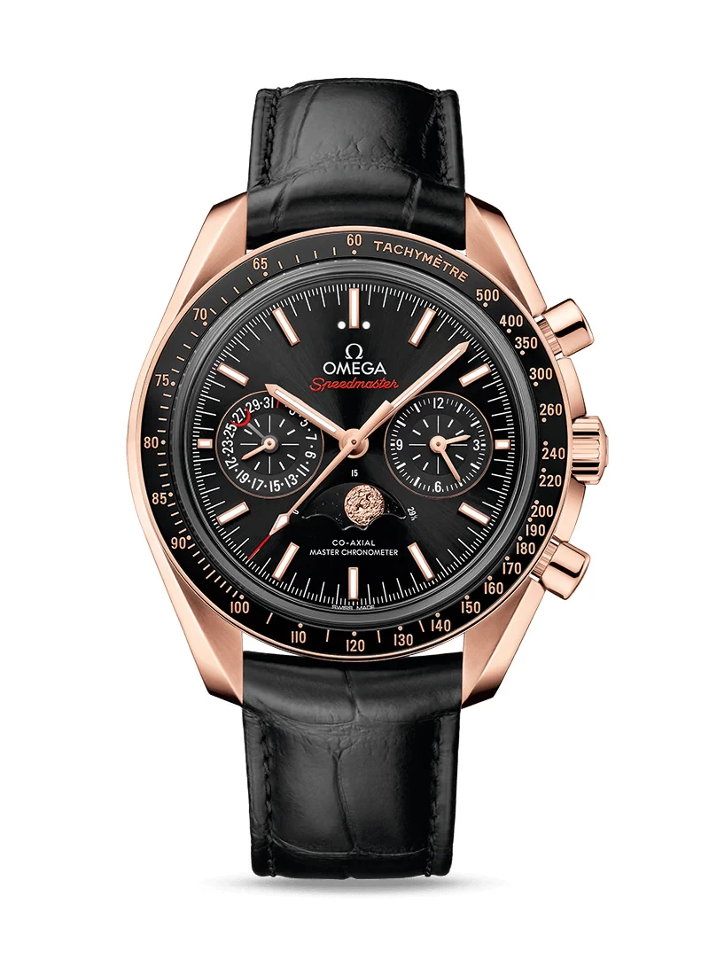 Indulge in the epitome of luxury with the Omega         304.63.44.52.01.001. This stunning timepiece features a 44.25 mm 18K Sedna™ gold case that radiates sophistication. Black ceramic bezel ring with Ceragold™ tachymeter scale.