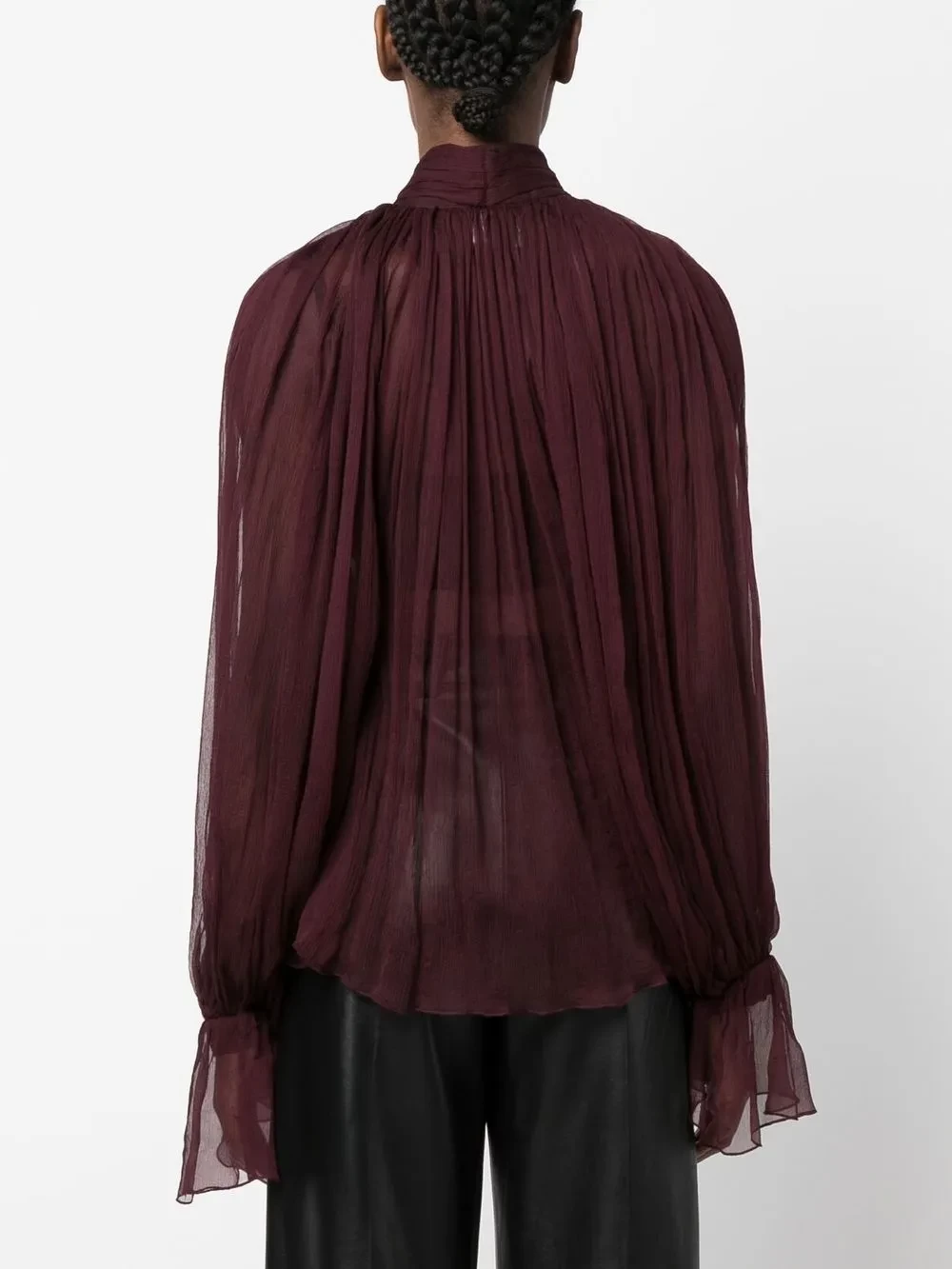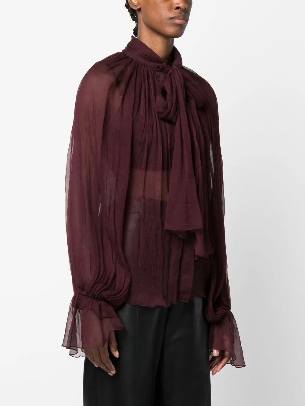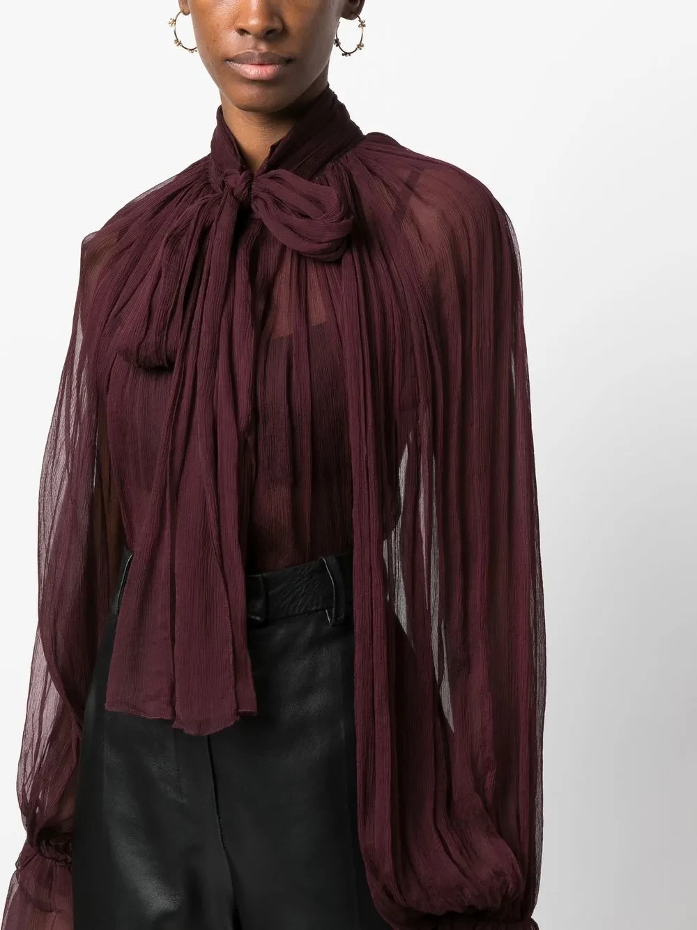 burgundy silk semi-sheer construction gathered tie neck long puff sleeves crease effect straight hem