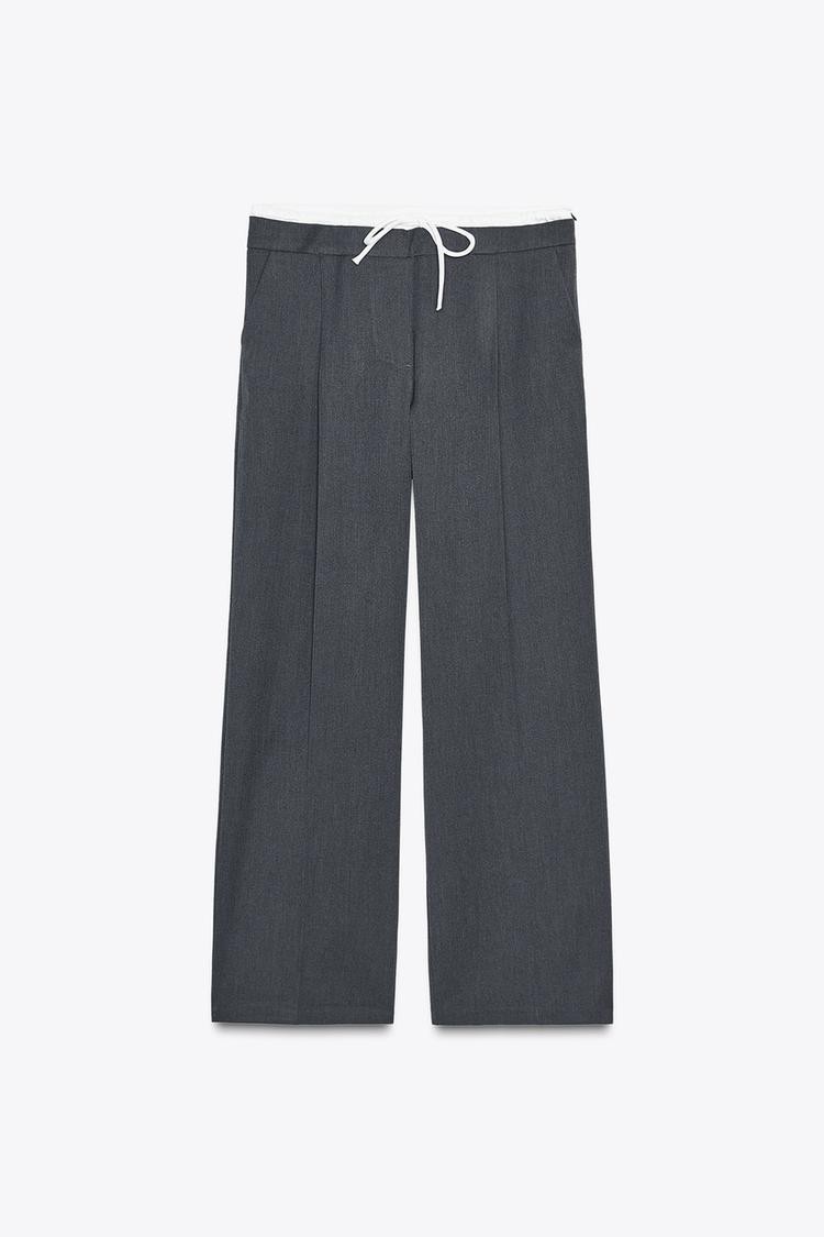 High-waisted trousers in a crisp, fluid fabric with a wide-leg silhouette and front pleats. Offers a sophisticated, polished look.
